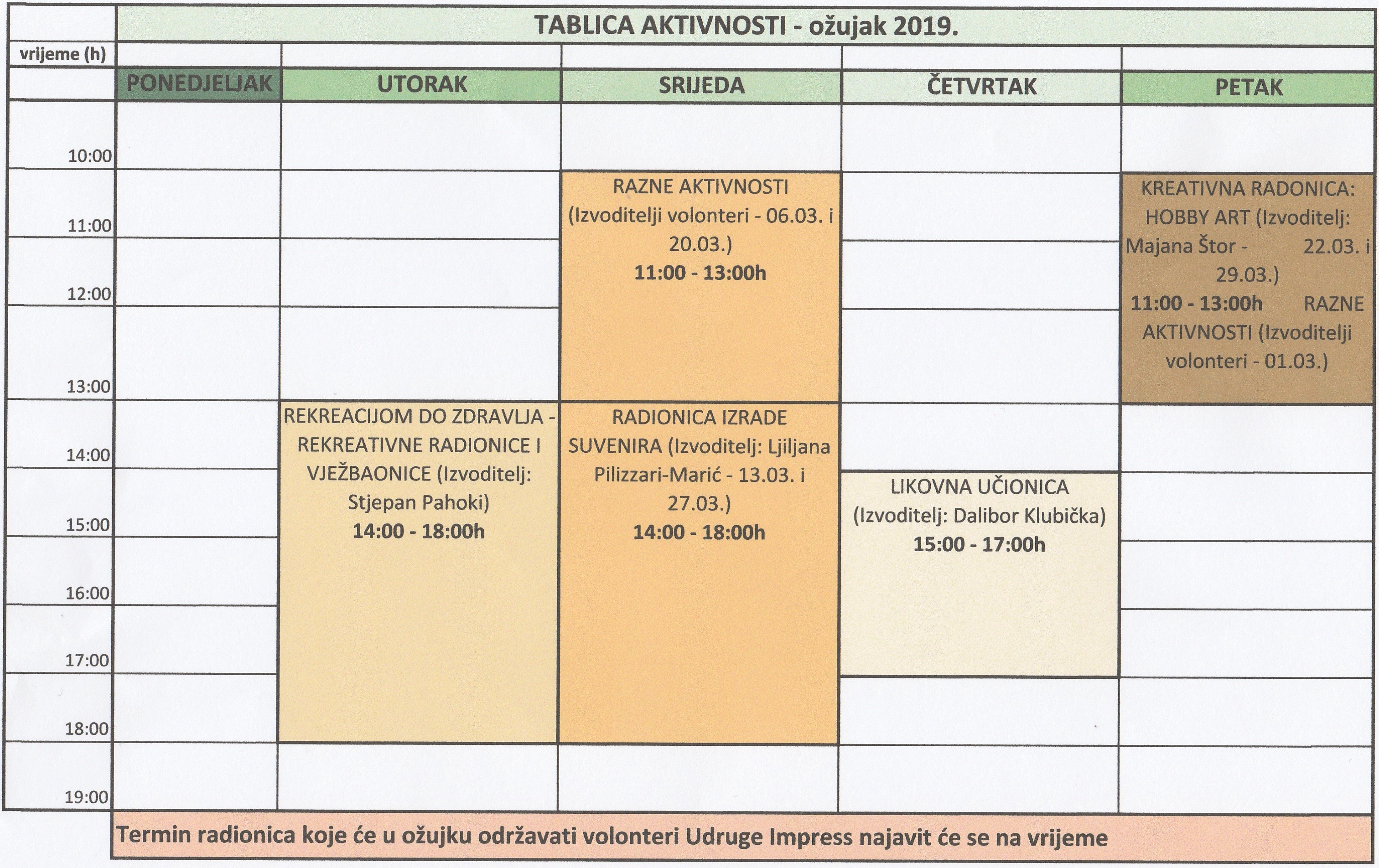 PROGRAM “AKO SAM UKLJUČEN, NISAM ISKLJUČEN” – RASPORED OŽUJAK / Objave, Program - Poludnevni boravak / By Urednik Na slici možete vidjeti raspored održavanja radionica u sklopu programa za mjesec ožujak. Pozivamo vas da sudjelujete na radionicama gdje su uz druženje i aktivnosti osigurana prehrana i osvježenje.